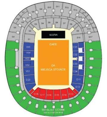 Tak, możesz samodzielnie wybrać miejsca z mapy obiektu. By użyć tej metody zainstaluj bezpłatnie Javę na swoim komputerze ( http://www.java.com/pl/ ) i upewnij się, że Twoja przeglądarka nie ma zablokowanych wyskakujących okien, tzw. ‘pop-up’ów’.Kliknij na rysunek ‘Mapa obiektu’, wybierz interesujący Cię obszar – zobaczysz mapę szczegółową. Kolor miejsca na mapie odpowiada właściwej kategorii cenowej opisanej w legendzie. Kolor szary oznacza, iż miejsca są niedostępne. Po wybraniu miejsca zostaną one dodane do listy miejsc pod głównym oknem. Możesz usunąć miejsca z listy klikając krzyżyk. Kliknij ‘Dodaj bilety do koszyka’